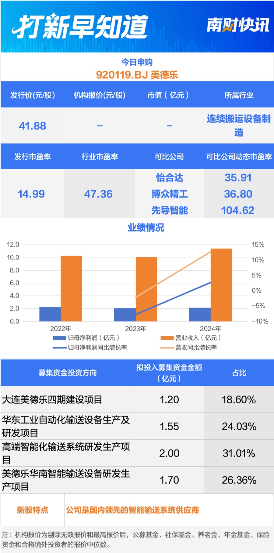 新股申购:美德乐 (920119.BJ) - 公司是国内领先的智能输送系统供应商,主营智能制造装备的研发、设计、制造和销售,主要产品为模块化输送系统和工业组件,属于智能物流装备 [2] - 发行价为每股41.88元,发行市盈率为14.99倍,显著低于行业市盈率47.36倍及部分可比公司市盈率(怡合达35.91倍,博众精工36.80倍,先导智能104.62倍)[3] - 公司业务聚焦工厂自动化的智能生产物流系统,广泛应用于新能源、汽车零部件、电子、仓储物流等行业,是国家高新技术企业、国家级专精特新“小巨人”企业,截至2025年9月30日拥有专利201项 [5] - 公司客户包括先导智能、比亚迪、宁德时代等新能源及智能制造领域知名企业 [5] - 2022年至2024年,公司归母净利润分别为0.0亿元、2.0亿元、8.0亿元,营业收入分别为4.0亿元、6.0亿元、10.0亿元,呈现快速增长 [3] - 本次募集资金主要用于四个生产及研发项目,拟投入总额6.45亿元,其中高端智能化输送系统研发生产项目占比最高,为31.01% [4] - 2022年至2025年上半年,公司前五大客户销售收入占比分别为59.34%、51.29%、47.50%和62.75%,客户集中度相对较高,主要与下游新能源电池领域市场集中度高有关 [6] 新股上市:爱舍伦 (920050.BJ) - 公司长期专注于医疗健康事业,主要从事应用于康复护理与医疗防护领域的一次性医用耗材的研发、生产和销售 [7] - 发行价为每股15.98元,发行市盈率为14.99倍,低于行业市盈率29.79倍及部分可比公司市盈率(振德医疗65.50倍,健尔康43.24倍)[8] - 公司是国内最大的医用护理垫生产商,也是国内医用敷料出口市场头部企业(排名前十),销售规模正逐渐向行业前四企业靠近 [10][11] - 公司已获得ISO13485:2016、欧盟CE认证、美国FDA注册等资质,核心客户包括全球知名医疗器械品牌商Medline集团(2024年全球百强榜第四位)、波兰的Zarys International Group及韩国的Sejong Healthcare co., Ltd [11] - 2021年至2024年,公司归母净利润从1.0亿元增长至7.0亿元,营业收入从2.0亿元增长至6.0亿元,业绩增长显著 [9] - 本次募集资金3.00亿元将全部投入凯普乐公共卫生医疗物资产业园建设项目 [10] - 2022年至2025年上半年,公司前五大客户销售收入占比分别为81.99%、86.27%、86.27%和88.40%,其中第一大客户Medline集团销售占比分别为71.51%、73.08%、71.00%和77.73%,存在客户集中度高及单一客户重大依赖的情形 [12]