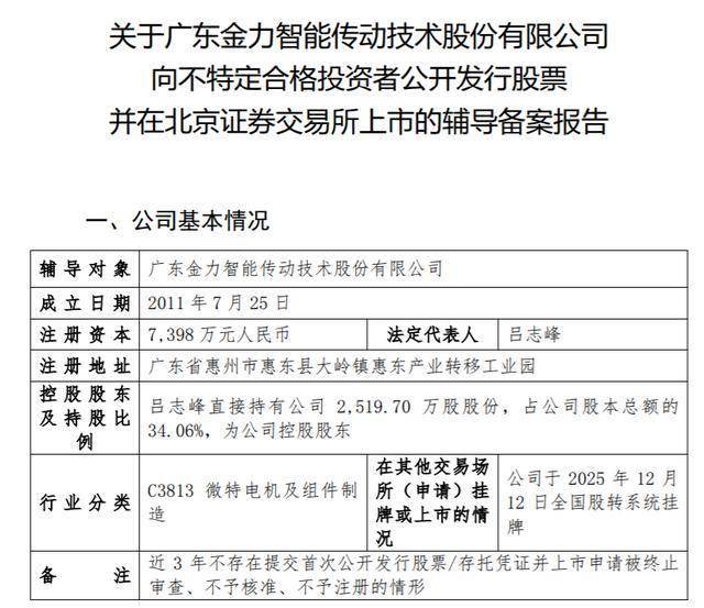 公司基本情况 - 公司全称为广东金力智能传动技术股份有限公司,成立于2011年7月25日,注册资本为7,398万元人民币,法定代表人为吕志峰 [1] - 公司注册地址位于广东省惠州市惠东县大岭镇惠东产业转移工业园 [1] - 公司控股股东为吕志峰,直接持有公司2,519.70万股股份,占公司股本总额的34.06% [1][6] - 公司于2025年12月12日在全国股转系统挂牌 [1] - 公司于2026年1月20日在广东证监局启动IPO辅导,拟于北京证券交易所上市,辅导机构为中信建投 [1] 行业与主营业务 - 公司行业分类为C3813微特电机及组件制造 [1] - 公司主要从事微型电机和微型传动系统的研发、生产与销售 [2] - 公司产品主要应用于智能清洁服务机器人领域 [2] 客户与市场地位 - 公司客户包括科沃斯、石头科技、追觅科技、美的集团、大疆、小米集团、比亚迪、优必选、方太集团、凯迪仕、哈啰出行、美团出行、ABB等国际国内一线品牌企业 [2] 财务业绩表现 - 2023年度、2024年度及2025年1-4月,公司营业收入分别为30,143.14万元、59,743.47万元及23,903.20万元,2024年收入较2023年增长约98.2% [3] - 2023年度、2024年度及2025年1-4月,公司净利润分别为1,148.96万元、6,398.85万元及1,913.97万元,2024年净利润较2023年增长约456.8% [3] - 2023年度、2024年度及2025年1-4月,公司扣除非经常性损益后的净利润分别为859.57万元、6,384.43万元及2,095.79万元 [3] - 2023年度、2024年度及2025年1-4月,公司毛利率分别为17.79%、23.60%及21.01% [3] - 2023年度、2024年度及2025年1-4月,公司加权平均净资产收益率分别为3.43%、17.52%及4.79% [3] 资产与负债状况 - 截至2023年末、2024年末及2025年4月30日,公司资产总计分别为49,392.85万元、71,392.25万元及73,330.49万元 [3] - 截至2023年末、2024年末及2025年4月30日,公司股东权益合计分别为34,101.62万元、38,977.47万元及40,047.32万元 [3] - 截至2023年末、2024年末及2025年4月30日,公司每股净资产分别为4.81元、5.55元及5.70元 [3] - 截至2023年末、2024年末及2025年4月30日,公司资产负债率分别为30.96%、45.40%及45.39% [3] - 截至2023年末、2024年末及2025年4月30日,公司流动比率分别为1.81倍、1.52倍及1.51倍 [3] - 截至2023年末、2024年末及2025年4月30日,公司速动比率分别为1.47倍、1.29倍及1.23倍 [3] 其他运营情况 - 报告期内,公司存在劳务派遣用工比例超过10%的情况 [4]