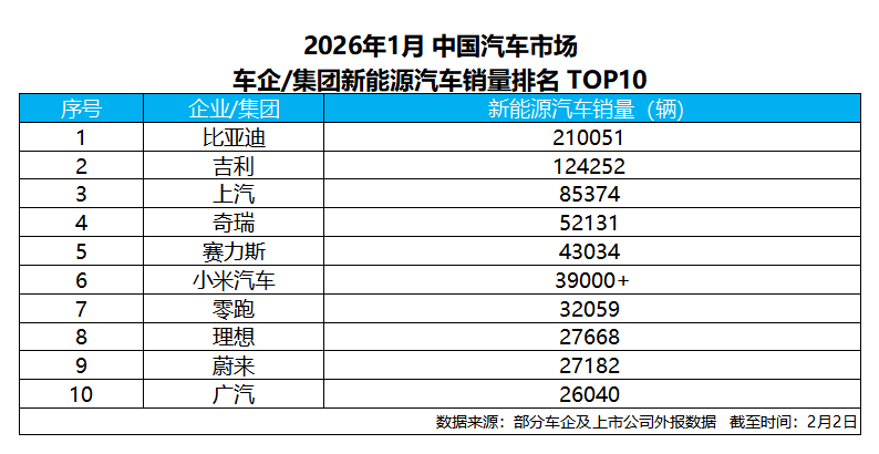 行业竞争格局 - 新年伊始中国新能源汽车市场竞争轮廓迅速显现头部车企之间的差距在1月销量榜单中被进一步拉开[1] - 比亚迪以超21万辆的新能源汽车销量位居行业首位展现出强大的市场竞争力继续稳居中国新能源市场头部位置并在主要车企中拉开明显差距[1] 主要车企销量数据 - 比亚迪1月新能源汽车销量为210,051辆位居行业第一[2] - 吉利汽车1月新能源汽车销量为124,252辆位居行业第二[2] - 上汽集团1月新能源汽车销量为85,374辆位居行业第三[2] - 奇瑞汽车1月新能源汽车销量为52,131辆位居行业第四[2] - 赛力斯1月新能源汽车销量为43,034辆位居行业第五[2] - 小米汽车1月新能源汽车销量超过39,000辆位居行业第六[2] - 零跑汽车1月新能源汽车销量为32,059辆位居行业第七[2] - 理想汽车1月新能源汽车销量为27,668辆位居行业第八[2] - 蔚来汽车1月新能源汽车销量为27,182辆位居行业第九[2] - 广汽集团1月新能源汽车销量为26,040辆位居行业第十[2]