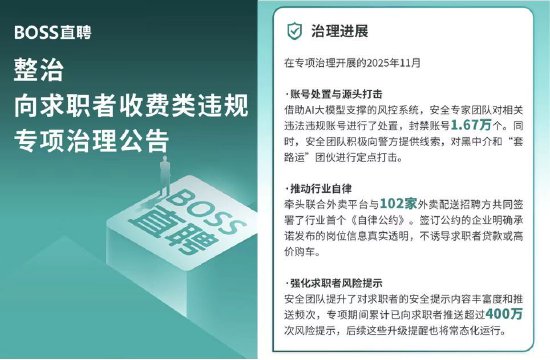 BOSS直聘:单月封禁1.67万涉“套路收费”类账号,推送超400万次风险提示