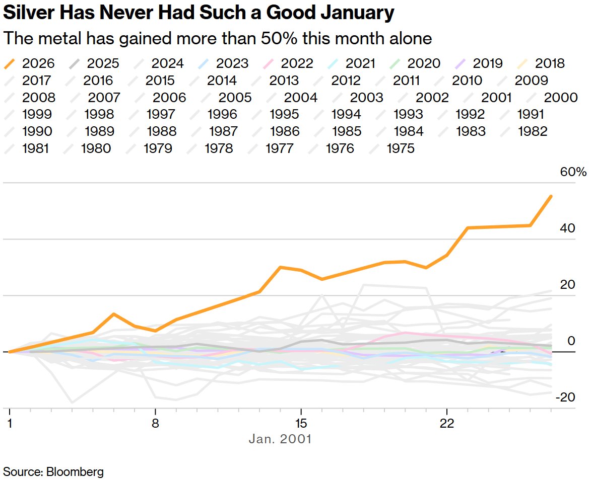 白银市场表现与驱动因素 - 白银价格年初至今上涨近50%,表现远超黄金超过15%的涨幅 [2] - 白银近期涨势比黄金更为迅猛,尽管已从周二约117美元的历史日内高点回落 [1][2] - 花旗银行将白银短期价格目标从100美元上调至150美元,这是本月内因价格突破先前预测后的第二次上调 [8] 价格上涨的核心驱动力 - 白银涨势主要由散户投资者兴趣驱动,与黄金受央行购买和机构对冲推动不同 [2][3] - 根据Vanda Research数据,就交易动能而言,白银已成为比人工智能宠儿英伟达更“热门”的交易品种 [4] - 昨日散户投资者向iShares Silver Trust净流入约1.71亿美元,创下该ETF有记录以来最大的单日散户净流入额 [4] 市场参与结构与资金流向 - 交易在追涨者与做空者之间分化,做空者通过ProShares UltraShort Silver ETF押注价格下跌 [5] - 新兴市场投资者似乎助推了价格上涨,近期上海价格高于伦敦价格 [6] - 中国唯一的白银ETF将于明日开始暂停新认购,以“遏制散户投机” [6] 价格前景与关键观察指标 - 分析师预计白银在短期内将继续跑赢市场,并称其为“打了兴奋剂的黄金” [4][7] - 花旗分析师认为,若黄金交易在5100至5400美元区间,且金银比在32左右(2011年低点),白银价格可能高达170美元 [8] - 若金银比达到1979年14的低点,白银可能交易在300美元水平,但花旗认为后者是“极不可能出现的情景” [8]