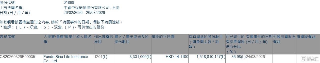 核心观点 - 中煤能源H股(01898.HK)遭其大股东Funde Sino Life Insurance Co., Ltd.减持,持股比例下降[1][2] 股东权益变动详情 - 减持方为Funde Sino Life Insurance Co., Ltd.[1][2] - 减持日期为2026年3月24日[1] - 减持方式为场内交易[1] - 减持数量为333.1万股[1] - 减持均价为每股14.11港元[1] - 减持总金额约为4700万港元[1] 减持前后持股情况 - 减持前,Funde Sino Life Insurance Co., Ltd.持股比例为37.07%[1] - 减持后,Funde Sino Life Insurance Co., Ltd.最新持股数目为1,518,810,147股[1][2] - 减持后,Funde Sino Life Insurance Co., Ltd.持股比例下降至36.98%[1][2]