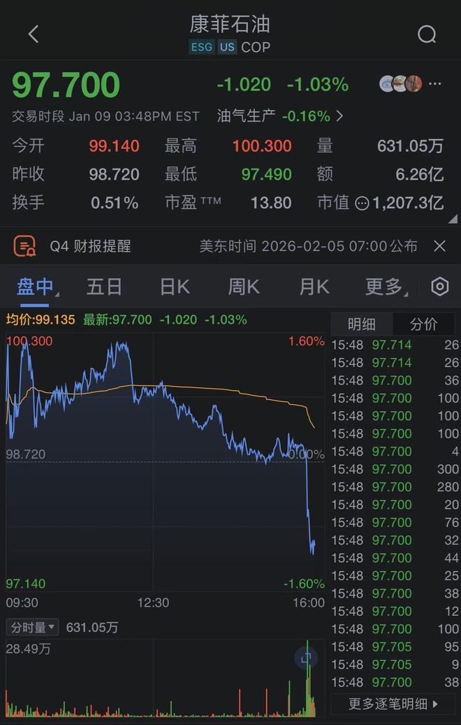 公司股价与交易动态 - 康菲石油股票在美东时间1月9日下午交易时段跌至盘中低点97.490美元[1][2] - 公司股票最新报97.700美元,当日下跌1.020美元,跌幅为1.03%[2] - 当日股价波动区间在97.490美元至100.300美元之间,开盘价为99.140美元[2] - 公司股票当日成交量为631.05万股,换手率为0.51%[2] - 公司总市值为1,207.3亿美元[2] 公司近期事件与日程 - 公司股价下跌发生在与特朗普会晤期间[1] - 公司预计将于美东时间2026年2月5日07:00公布第四季度财报[2]