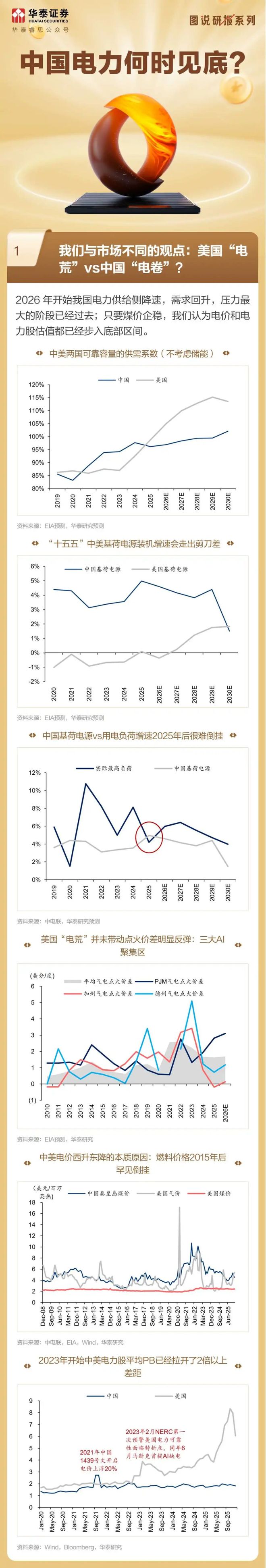 中美电力供需格局比较 - 2021-2022年,中国用电负荷增速超10%,主要由疫情后制造业及出口企业扩产带动 [14][16] - 美国本轮用电需求超预期主要源于AI数据中心基础设施的快速投资与建设 [14] - 2023年2月,美国NERC首次预警电力可靠性面临转折点,同年6月马斯克首提AI缺电问题 [12] 中美基荷电源发展态势 - “十五五”期间,中美基荷电源装机增速将走出“剪刀差” [6] - 2025年后,中国基荷电源增速相比用电负荷增速很难再出现倒挂 [7] - 美国在AI缺电背景下,其基荷电源在2022-2026年复合年增长率不增反减 [24][25] - 中国2020-2024年基荷电源增速的复合年增长率缺口比当前美国更大 [26][27] 电力装机与供需缺口 - 中国2022年缺电包含“缺电量”和“缺电力”,分别由煤价高企和高温天气导致,解决方式包括长协煤和上马基荷电源 [28] - 中国火电加速投产带动系统备用率回升,但装机缺口相比最高用电负荷增速直到2025年才开始收窄 [34][35][37] - 美国“缺电”同样呈现较高的“局部性”,2025年各地批发侧电能量市场电价同比变化差异显著,部分地区涨幅超40% [38][39][40] 中美电价结构与趋势 - 美国整体电价显著高于中国,主要差异在于输配电价等电能量电价以外的系统性成本 [41][42] - 2024-2026年,美国终端电价上涨的主要驱动因素是燃料成本上涨,贡献率达70% [45][66] - 中国工业电价将从2026年起明显低于美国,主要因中美燃料成本“东降西升”所致,这将增强中国制造业竞争力 [47][48][51] - 2008年金融危机后,美国居民电价上涨幅度持续高于工商业电价 [52][54][55] - 中美电能量电价长周期趋势基本一致,预计从2026年开始趋同 [57][58][59] 容量电价与燃料成本 - 美国PJM等市场的容量电价能有效反映基荷电源缺口,当地火电容量电价贡献的利润可能超过50% [60][61] - 2024-2026年美国电价上涨中,天然气价格上涨贡献了39%,气电点火价差上涨贡献了16% [45][66] - 2023-2026年中国终端电价下降,主要受上游煤价下跌影响,但中间环节扩张导致终端降幅小于上游 [63][66] - 2025年下半年起中美电价出现倒挂,主因美国天然气与中国煤价走出剪刀差,预计2026年中国煤价中枢回升至750元/吨将支撑电价 [65][67] 电源结构未来展望 - 2025年是中国火电和基荷电源装机增速的高点,2026年开始增速将显著下降 [68][69][70] - 中国风光装机增速将从2026年开始显著下行 [71] - 中美两国电力结构中火电仍是绝对主力,在2030年前可再生能源发电量占比难以超过50% [19][21]