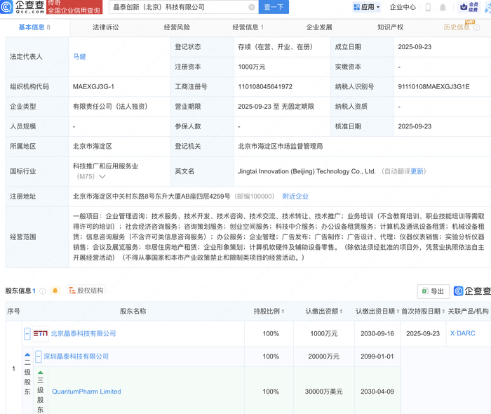 企查查APP显示,近日,晶泰创新(北京)科技有限公司成立,注册资本1000万元,经营范围包含:创 业空间服务;科技中介服务;办公设备租赁服务;计算机及通讯设备租赁等。企查查股权穿透显示,该 公司由晶泰控股关联公司北京晶泰科技有限公司全资持股。 | © 北章章 全国企业信用意调 | 昌泰创新(北京)科技有限公司 | | ○ 童一下 | | ■应用,企业中心 ■ 真 内震 公 | | --- | --- | --- | --- | --- | --- | | 基本信息 8 | 法律诉讼 | 经营风险 | 经营信息 1 企业发展 | | 历史信息 ( 知识产权 | | 法定代表人 | 马健 | 登记状态 | 存续(在营、开业、在册) | 成立日期 | 2025-09-23 | | | | 注册资本 | 1000万元 | 实缴资本 | | | 组织机构代码 | MAEXGJ3G-1 | 工商注册号 | 110108045641972 | 纳税人识别号 | 91110108MAEXGJ3G1E | | 企业类型 | 有限责任公司(法人独资) | 营业期限 | 2025-09-23 至 无固定期限 | 纳税人资质 | | ...
