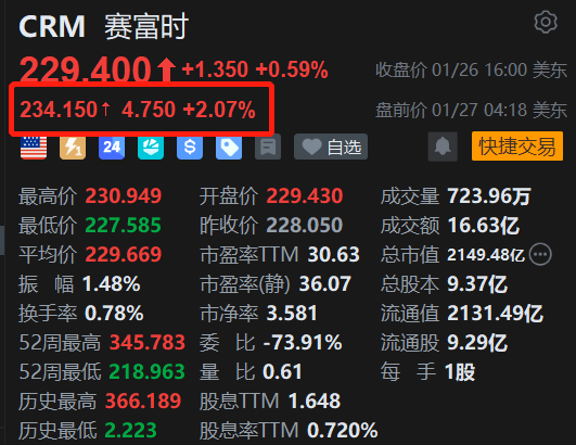 | CRM 赛富时 | | | | --- | --- | --- | | 229.400↑+1.350 +0.59% | | 收盘价 01/26 16:00 美东 | | 234.150 + 4.750 +2.07% | | 盘前价 01/27 04:18 美东 | | 三 7 24 华 S 9 日 ♥ 自选 | | ● 快捷交易 | | 最高价 230.949 | 开盘价 229.430 | 成交量 723.96万 | | 最低价 227.585 | 昨收价 228.050 | 成交额 16.63亿 | | 平均价 229.669 | 市容率 IM 30.63 | 总市值 2149.48亿(…) | | 振 幅 1.48% | 市盈率(静) 36.07 | 总股本 9.37亿 | | 换手率 0.78% | 市净率 3.581 | 流通值 2131.49亿 | | 52周最高 345.783 | 委 比 -73.91% | 流通股 9.29亿 | | 52周最低 218.963 | 量 比 0.61 | 色 主 1路 | | 历史最高 366.189 | 股息TTM 1.648 | | | 历史最低 2. ...