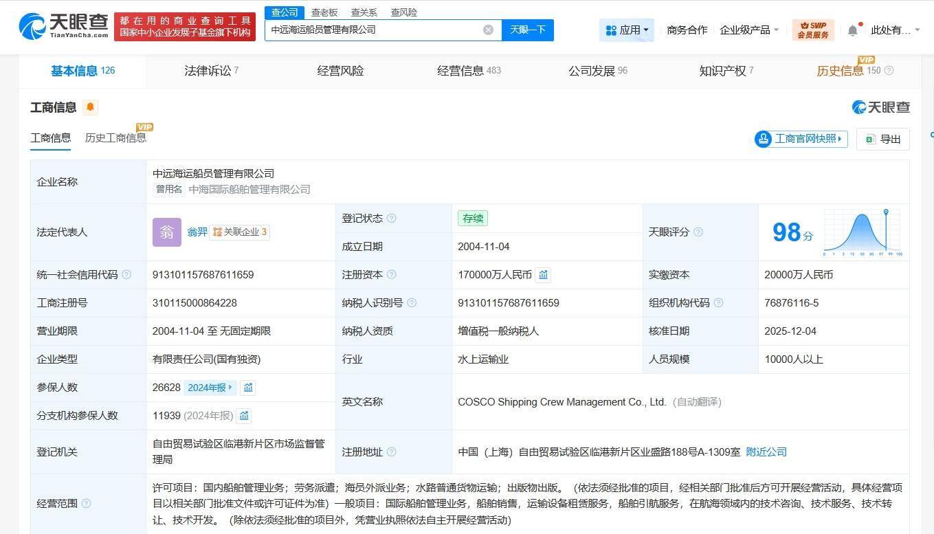 中远海运船员管理有限公司成立于2004年11月,经营范围含国内船舶管理业务、劳务派遣、海员外派业 务、水路普通货物运输、出版物出版、国际船舶管理业务、船舶销售、运输设备租赁服务等。股东信息 显示,该公司由中国远洋海运集团有限公司全资持股。 天眼查工商信息显示,12月4日,中远海运船员管理有限公司发生工商变更,韩超卸任法定代表人、董 事长,由翁羿接任,注册资本由7亿人民币增至17亿人民币,增幅约143%,同时,多位高管发生变更。 ...
