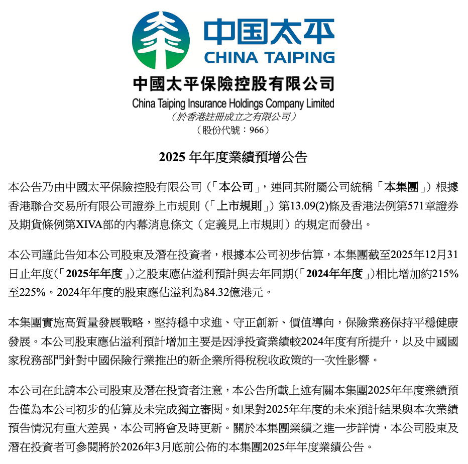 公司业绩预告 - 中国太平保险控股有限公司预计其2025年度的归母净利润将较2024年同期的84.32亿港元大幅增长约215%至225% [1] - 业绩预增的主要原因之一是公司的净投资业绩较2024年度有所提升 [1] - 业绩预增的另一主要原因是国家税务部门针对保险行业推出的新企业所得税税收政策带来的一次性积极影响 [1]