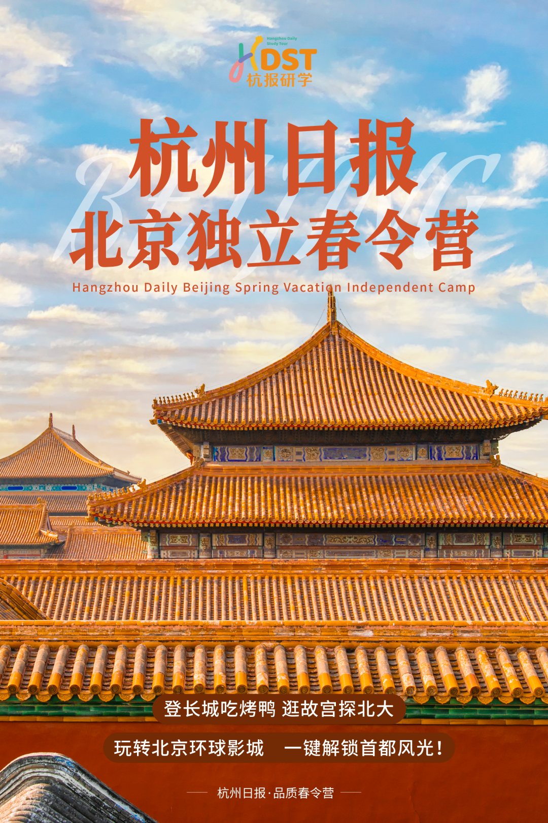 产品核心概览 - 杭州日报研学旅行栏目推出2026年春假北京研学独立营 活动时间为2026年4月26日至30日 共5天4晚 [2][9][12] - 该产品为针对小学3年级至初中8年级学生设计的独立营 要求参与者独立参加 [2][99] - 活动定价为市场指导价7080元/人 提供单人报名优惠价6880元/人及三人及以上组团优惠价6680元/人 14岁及以上参与者需额外补高铁差价650元/人 [2][98][104] 行程与内容设计 - 行程设计紧凑 覆盖北京历史文化 现代科技与高等学府等多重体验 具体包括天安门广场 故宫博物院 居庸关长城 北京大学 军事博物馆 中国科学技术馆 天坛公园及北京环球影城等核心景点 [94][95][196][197] - 行程强调深度体验与教育意义 例如在故宫领悟中华文明与建筑秩序 在长城进行意志锤炼 在北大埋下梦想种子 在军博感受国防力量 在科技馆培养科学思维 [14][20][39][44][50][59] - 行程包含特色文化及美食体验 如品尝全聚德烤鸭 紫光园酸奶 在前门大街感受京味儿 并安排豆汁 糖葫芦等体验 [79][82][94][181][184] 运营与服务质量 - 公司拥有超过10年的独立营执行经验 拥有正规活动组织资质 其西安 内蒙古等线路曾获好评无数 [85][187] - 采用高师资配置 师生配比为1:4 每团限额32人 配备包括讲解 领队 卫生保健 生活老师及专业摄影老师在内的团队 确保全程守护 [2][89][99][191] - 住宿标准为四钻北京原拓酒店 安排2人一个标间 承诺住宿环境干净 卫生 舒适 [92][194] - 费用采用一价全包模式 包含住宿 餐饮 门票 活动 保险 交通及所有服务人员费用 承诺全程无额外消费 [99][201] 市场与客户反馈 - 公司于2026年2月成功举办了首期北京独立营 行程规划与老师服务得到了孩子与家长的一致认可 为本次再度出发积累了口碑 [2][104] - 产品定位明确 旨在让孩子从“走马观花的游客”转变为“独立探索世界的少年” 在旅行中实现成长与教育目标 [7][109]
