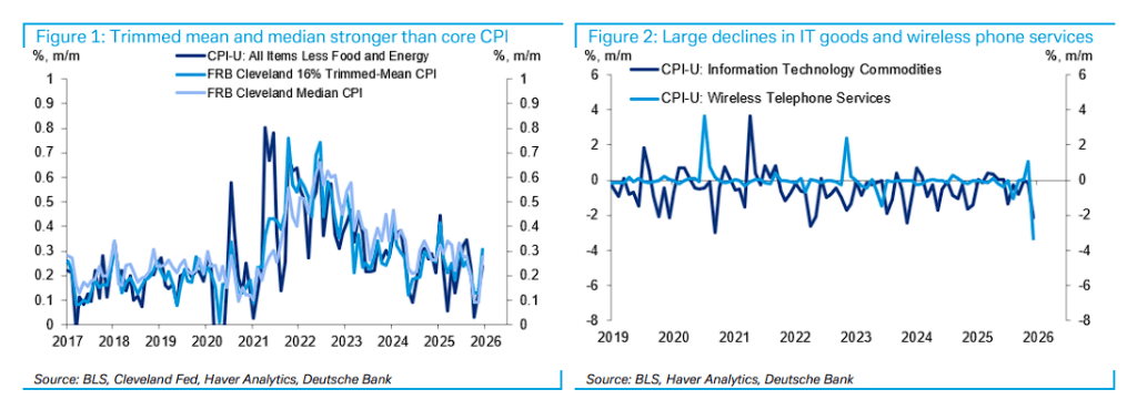 12月美国CPI数据表现与市场解读 - 美国劳工统计局公布12月核心CPI同比上涨2.6%,创2021年3月以来最低,环比上涨0.2%,低于预期的0.3% [1] - 市场对这份看似指向通胀降温的报告反应平淡,未将其视为美联储加速降息的明确信号 [1] 华尔街机构对CPI数据质量的质疑 - 德意志银行与摩根士丹利指出,12月CPI数据充斥不可持续的统计噪音与扭曲,真实通胀走势需参考后续公布的核心PCE物价指数 [1] - 德银研报指出,12月CPI降温是技术性因素导致的假象,信息技术商品价格当月下跌2.16%,无线电话服务价格下跌3.33%,两项合计拉低核心CPI约6个基点,这类波动非持续趋势 [1] 剔除异常值后的通胀指标表现 - 克利夫兰联储截尾均值CPI与中位数CPI在12月环比分别为0.31%、0.28%,均高于同期核心CPI环比0.2% [3] - 克利夫兰联储截尾均值CPI与中位数CPI在12月同比分别升至2.95%、3.08%,显著高于核心CPI的2.64% [3] 商品细分价格数据反映的潜在压力 - 12月服装价格上涨0.59%,创2025年2月以来第二大月度涨幅 [3] - 12月家庭用品价格上涨0.54%,为2024年11月以来第三大涨幅 [3] - 德银分析认为,这可能是前期政府关门导致数据收集延迟的扭曲回补,11月数据因假日促销被人为压低,12月出现反向修正 [3] 住房租金走势分析 - 12月主要住所租金月率上涨0.26%,业主等价租金月率上涨0.31%,均回归2025年前九个月平均增速 [3] - 德银强调此次租金反弹非数据缺失导致的假象,而是真实价格上涨 [3] 核心PCE物价指数预测出现反转 - 摩根士丹利预警,CPI与PCE正形成显著“剪刀差”,基于12月CPI报告,大摩上调了核心PCE预测 [3] - 大摩将12月核心PCE月率预测从0.37%上调至0.46% [4] - 大摩预测若兑现,12月核心PCE同比将升至2.90%,远超11月的2.67% [5] PCE与CPI数据差异的原因分析 - 核心差异在于两大通胀指标的权重分配,PCE篮子中权重更高的商品与服务类别在12月涨价势头强劲 [4] - 视频媒体租赁价格环比飙升19.5%,单项贡献核心PCE约8个基点,软件价格上涨同样贡献8个基点,剔除这两项,核心PCE月率仍达0.30% [4] - 大摩预测12月核心商品PCE环比0.46%,远高于CPI中核心商品持平的表现,差异源于CPI中疲软的新车、二手车权重较低,而PCE中权重更高的电器、软件、电子产品等价格加速上涨 [5] 关税对通胀的潜在影响 - 德银与大摩观察到,关税敏感型商品价格在12月再度上行,延续10-11月短暂回落后的涨势 [6] - 德银指出,服装价格尚未明显反映关税压力,但产业链上游的进口价格与生产者价格指数(PPI)中的服装类别已显示管道压力,消费端涨价或只是时间问题 [6] 美联储对数据的可能反应 - 德银认为,12月CPI是扭曲数据回补与真实疲软信号的混合体,美联储需要更多数据支撑,才会释放进一步降息信号 [8] - 大摩判断,美联储或可识别数据“杂音”,并可能淡化核心PCE推算中的强势表现,但数据不确定性将促使美联储保持谨慎 [8]