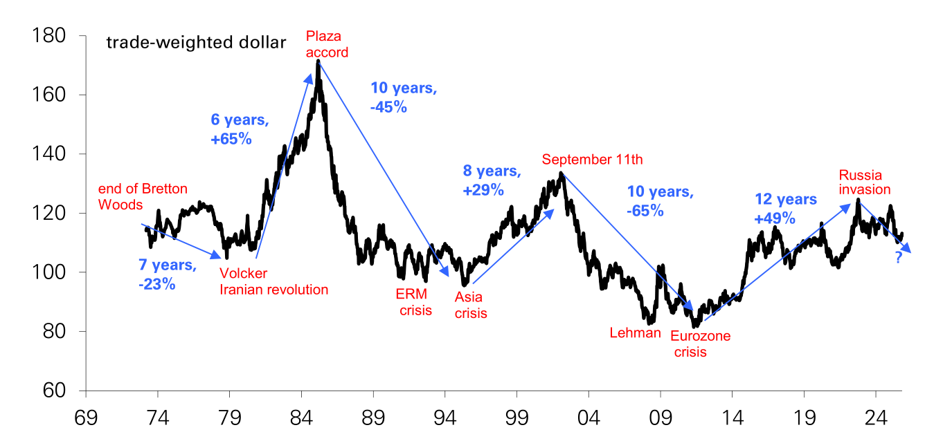 文章核心观点 - 德意志银行报告指出支撑美元价值的三大周期性支柱正在全面松动,预示着美元正逐步进入下行通道 [1] - 美元的主导地位短期难以撼动,但其价值已出现清晰的下行趋势 [1] 收益率优势 - 历史上美元作为G10货币中排名前三的高收益货币时从未经历过熊市,这是过去几年支撑美元汇率的关键因素 [2] - 根据市场对G10央行利率的预测,美元的收益率排名正面临显著下滑,预计将从现在的最高位下滑至2026年底及2027年底的中游位置 [5] - 英镑、澳元、挪威克朗等货币的收益率排名预计将超越美元 [5] - 美联储货币政策是驱动美元波动的最主要因素,其相对收益率优势的丧失移除了支撑美元价值的关键基石 [9] 经济增长优势 - 过去数年美国经济相对于其他主要经济体的卓越增长表现是吸引资本流入并推高美元的另一强大动力,但此趋势正在逆转 [9] - 美元走强往往伴随美国相对其他G20经济体增长更强,但这种优势更多源于全球对其他地区更具杀伤力的冲击,使得美国显得相对更强 [9] - 在2024-2026年期间,美国财政政策将趋于收紧,而欧元区和英国等地的财政政策更具刺激性,这将削弱美国经济的相对增长优势 [11] 国际收支动态 - 美国经常账户赤字是美元持续的脆弱性来源,历史数据显示一旦该赤字占GDP比重超过4%,美元无一例外都会走弱,目前美国正接近此危险区域 [15] - 自2020年以来,推动美元走势的主导因素已从传统国际收支基本面转向对冲行为和其他金融流动 [18] - 外国投资者购买美国资产时,未对冲的资金流入量持续下降,而已对冲的资金流入量稳步上升,反映出市场对美元未来走势的悲观预期 [21] - 这种去美元化的对冲行为本身就构成对美元的下行压力 [21]