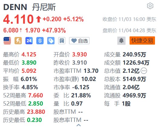 美股异动丨丹尼斯盘前大涨48% 获私有化收购