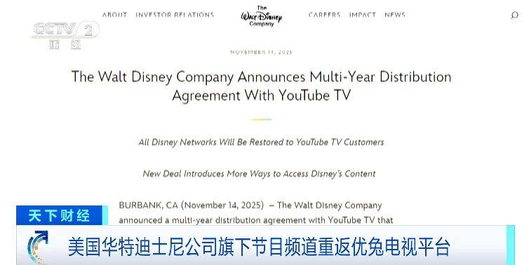 协议达成与内容恢复 - 华特迪士尼公司与Youtube TV达成一项多年期协议,旗下多个节目频道恢复在Youtube TV平台上提供付费观看服务[1][3] - 双方此前的合作协议于上个月底到期,因谈判陷入僵持,导致超1000万订阅用户在过去两周内无法观看迪士尼旗下频道的节目[1][3] - 目前Youtube TV的付费订阅用户可观看迪士尼旗下的新闻、体育、娱乐等节目频道[3] 谈判核心争议与背景 - 达成新协议的核心争议点在于价格,迪士尼方面称体育赛事转播费用提高,播出平台需支付更多费用[5] - 迪士尼自有流媒体平台Hulu+直播电视平台的付费订阅用户数量增加,为公司与Youtube TV谈判提供了新筹码[5] 下架事件的负面影响 - 频道下架导致大量Youtube TV平台订阅用户不满,一项最新调查显示近四分之一付费订阅用户正在考虑或已经取消订阅[7] - 据摩根士丹利分析师估算,节目频道从Youtube TV平台下架导致迪士尼每天收入损失超过400万美元[7] 行业趋势与用户变化 - 美国传统有线电视用户数量持续下滑,2024年用户数量与2020年相比减少了约30%[7] - Youtube TV平台的订阅用户数量从2020年的约300万增至目前的约1000万[7]