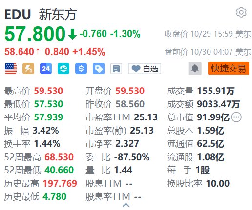 新东方(EDU.US)盘前涨1.45%报58.64美元。消息面上,新东方近日公布第一财季业绩,期内净营收 15.23亿美元,同比增6.1%,高于预期。绩后,摩根大通发报告指,经调整后该公司业绩较彭博预期有 10%以上的上调空间,这预示着整个2025财年的残酷下行周期即将结束。摩通认为,新东方重回盈利增 长轨道,且前景明朗,此外,其资本回报率强势,目前已超过5%。 | EDU 新东方 | | | --- | --- | | 57.800 4 -0.760 -1.30% | 收盘价 10/29 15:59 美东 | | 58.640 + 0.840 +1.45% | 盘前价 10/30 04:07 美东 | | 一 24 24 4 8 8 8 月 0 自选 | ● 快捷交易 | | 最高价 59.530 开盘价 59.530 | 成交量 155.91万 | | 最低价 57.530 昨收价 58.560 | 成交额 9033.47万 | | 平均价 57.939 市盈率 M 25.13 | 总市值 91.99亿 (…) | | 振 幅 3.42% 市盈率(静) 25.13 | 总股本 1.59亿 | | 换手率  ...