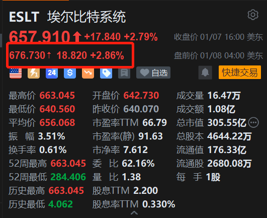 | ESLT 埃尔比特系统 | | | | --- | --- | --- | | 657_910 ↑ +17.840 +2.79% | | 收盘价 01/07 16:00 美东 | | 676.730 ↑ 18.820 +2.86% | | 盘前价 01/08 04:00 美东 | | 三 7 24 S m 9 目 ♥ 白 一 中 | | ● 快捷交易 | | 最高价 663.045 | 开盘价 642.730 | 成交量 16.47万 | | 最低价 640.560 | 昨收价 640.070 | 成交额 1.08亿 | | 平均价 656.068 | 市盈率TM 66.79 | 总市值 305.55亿(--) | | 振 幅 3.51% | 市盈率(静) 91.63 | 总股本 4644.22万 | | 换手率 0.61% | 市净率 7.612 | 流通值 176.33亿 | | 52周最高 663.045 | 委 比 62.16% | 流通股 2680.08万 | | 52周最低 284.406 | 量 比 1.38 | 每 手 1股 | | 历史景高 663.045 | 股息TTM 2.200 | ...