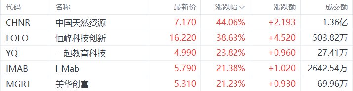 | 代码 | 名称 | 最新价 | 涨跌幅√ | 涨跌额 | 成交额 | | --- | --- | --- | --- | --- | --- | | CHNR | 中国天然资源 | 7.170 | 44.06% | +2.193 | 1.36亿 | | FOFO | 恒峰科技创新 | 16.220 | 38.63% | +4.520 | 503.82万 | | YQ | 一起教育科技 | 4.990 | 23.82% | +0.960 | 27.41万 | | IIMAB | I-Mab | 5.790 | 21.38% | +1.020 | 2642.54万 | | MGRT | 美华创富 | 5.310 | 21.23% | +0.930 | 69.96万 | 中概股收盘涨幅前五的个股为:中国天然资源涨44.06%,恒峰科技创新涨38.63%,一起教育科技涨 23.82%,I-Mab涨21.38%,美华创富涨21.23%。(格隆汇) ...