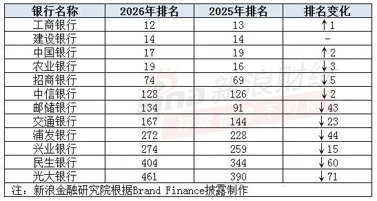 品牌价值榜单概览 - Brand Finance在达沃斯发布2026年全球品牌价值500强报告,多家中国银行和保险公司上榜[1] - 中国品牌入围总价值实现两位数增长,彰显强劲发展韧性[7] - 全球最具价值品牌前三名为苹果(品牌价值6076.4亿美元,增长5.8%)、微软(品牌价值5652.5亿美元,增长22.6%)、谷歌(品牌价值4330.8亿美元,增长4.9%)[7] 上榜银行排名与表现 - 工商银行以908.8亿美元的品牌价值和91.5分的品牌强度指数(AAA+评级)位列全球银行品牌榜首,总排名第12位[2] - 建设银行排名第14位,品牌强度评级为AAA+,排名与上年相同[3] - 中国银行排名上升2位至第17位,品牌强度评级为AAA+,超越农业银行[2][3] - 农业银行排名下降3位至第19位,品牌强度评级为AAA(上年为AA)[2][3] - 招商银行是排名最靠前的股份制银行,位列第74位[3] - 中信银行排名第128位,超越邮储银行,但较上年下降2位[3] - 邮储银行排名第134位,较上年下降43位[3] - 交通银行排名第167位,较上年下降23位[3] - 浦发银行和兴业银行排名均在300名以内,分别为第272位和第274位[4] - 光大银行排名下滑最多,下降71位至第461位[1][4] - 民生银行排名下滑60位至第404位[1][4] 上榜保险公司排名与表现 - 中国平安是唯一进入全球100强的国内保险公司,排名第32位,品牌强度评级为AAA-[5] - 中国人寿排名第104位,上升5位[5] - 中国人保排名第145位,上升5位[5] - 太平洋保险排名第168位,下降2位[5] - 友邦保险排名第174位,上升5位[5] - 保诚保险排名下滑明显,下降117位至第350位[1][5][6] - 国泰人寿排名上升较多,上升80位至第407位[5][6] 其他中国品牌亮点 - 共有12个中国品牌跻身全球品牌价值前五十强[7] - 抖音品牌价值增长45.1%,达到1535.4亿美元,跃居全球第6位[7] - 国家电网以1024.4亿美元的品牌价值位居全球公用事业行业第一,品牌价值增长19.6%,稳居全球前十强[8] - 中国南方电网品牌价值增长33.2%,达到119.6亿美元,成为全球公用事业行业增长最快的品牌[8]