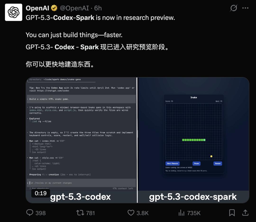 OpenAI发布GPT-5.3-Codex-Spark - 公司正式发布专为实时编码场景设计的GPT-5.3-Codex-Spark研究预览版本,该模型是从GPT-5.3-Codex主模型中“裁剪”而来的精简版本[1] - 模型定位并非替代现有Codex,而是补齐其在“即时交互”场景中的短板,目标是将人与模型之间的交互延迟压缩到接近“无感”的程度[3] - 此次发布是公司与芯片初创企业Cerebras合作的重要阶段性成果,上个月签署了一项金额超过100亿美元的协议以使用Cerebras硬件提升模型响应速度[3] - 模型核心是“速度”,专为实时使用而设计,支持针对性编辑、重塑逻辑或优化界面并立即查看结果,针对高频、碎片化、对即时反馈极度敏感的使用场景[4] - 在执行长时间运行任务方面展现出卓越优势,无需人工干预即可自主运行数小时、数天甚至数周,使Codex能同时支持长时间复杂任务和即时工作[4] - 模型在发布时拥有128k的上下文窗口,且仅支持文本,研究预览期间拥有独立的速率限制,使用量不计入标准速率限制[5] - 针对交互式工作进行了优化,用户可与模型实时协作,在运行过程中随时中断或重定向它,并快速迭代以获得近乎即时的响应[6] - 作为小型模型,在SWE-Bench Pro和Terminal-Bench 2.0等评估智能体软件工程能力的基准测试中表现出色,且完成任务所需时间远低于GPT-5.3-Codex[7] - 研发过程中实现了端到端的延迟优化,对底层架构进行了系统级优化,量化结果包括客户端/服务器单次往返开销降低80%,每个token的处理开销降低30%,第一个token的出现时间缩短50%[11][13] - 社区反馈关注在速度提升的同时,模型是否能维持足够的推理深度与代码质量,有观点指出速度快但有缺陷的代码毫无用处[12][14] 谷歌更新Gemini 3 Deep Think - 公司同步更新了旗下最具研究取向的推理模型Gemini 3 Deep Think,这是一次明确面向现代科学研究、工程建模与复杂推理问题的系统性升级[16] - 模型目标并非更流畅的对话体验,而是解决长期困扰科研人员和工程师的“硬问题”,这些问题往往缺乏明确解题路径、不存在唯一正确答案且数据不完整[20] - 更新是在与大量科学家和研究人员长期合作基础上完成的,设计思路偏向真实科研与工程实践,而不仅是抽象推理能力的展示[20] - 全新Deep Think已在Gemini应用中上线,供Google AI Ultra订阅用户使用,并首次通过Gemini API向部分研究人员、工程师和企业开放使用权限[20] - 在多项严苛学术基准测试中刷新当前水平,在Humanity's Last Exam中取得48.4%的成绩,在ARC-AGI-2测试中取得84.6%的成绩并已通过官方验证[24] - 在竞技编程平台Codeforces上,模型达到3455 Elo评分区间,属于极高段位,其编码能力排名世界第八[26][27] - 相比以往,此次更新明显扩大了能力覆盖范围,在化学、物理等多个科学领域中展现出显著提升[31] - 在2025年国际物理奥林匹克竞赛和国际化学奥林匹克竞赛的笔试部分均达到金牌级别表现,在CMT-Benchmark中取得50.5%的分数[31] - 在2025年国际数学奥林匹克竞赛的评测中,整体表现达到金牌水平[32] - 根据基准测试对比表格,Gemini 3 Deep Think在ARC-AGI-2、Humanity's Last Exam、国际数学奥林匹克、国际物理奥林匹克、国际化学奥林匹克及Codeforces等多个关键指标上领先于Gemini 3 Pro Preview、Claude Opus 4.6 Thinking Max及GPT-5.2 Thinking xhigh等对比模型[33] - 公司强调模型设计目标并非单纯在榜单中取得高分,而是定位为辅助研究与工程决策的工具,可用于帮助理解复杂数据、协助建模与仿真、提供多路径推理支持[34][37] - 社区反馈认为此次更新是重要的升级,有观点指出可将草图转化为3D打印模型的功能能提升原型制作速度近10倍,并认为人工智能缩短工程时间、改进科学建模及降低研发成本将带来真正变革[38][41]