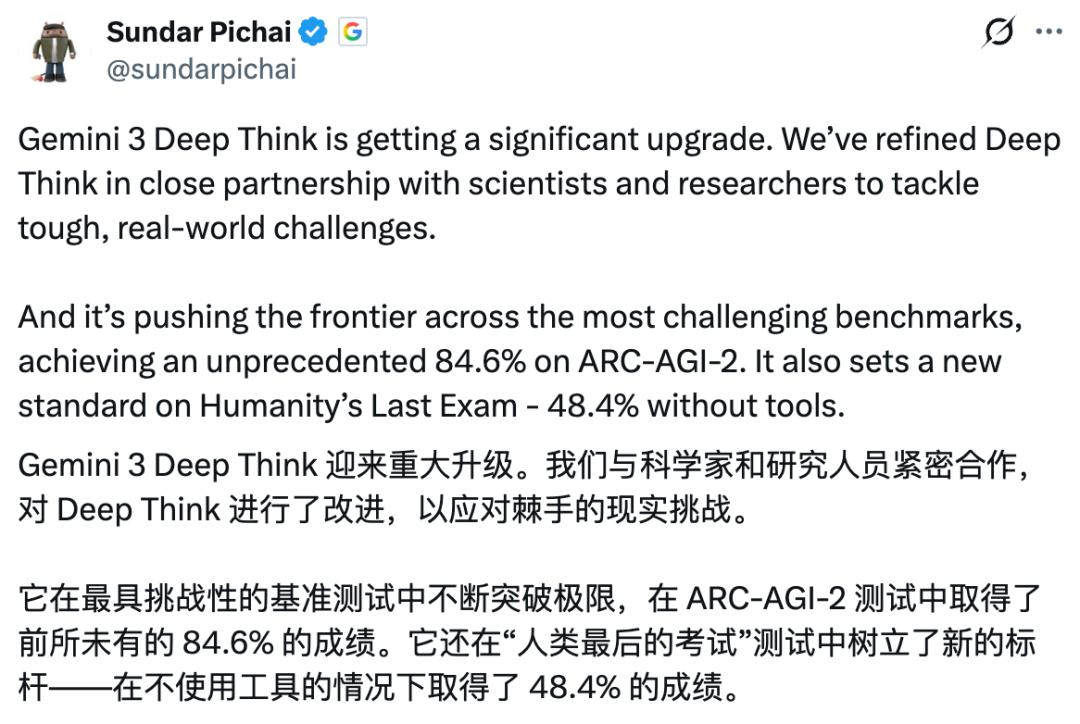 谷歌Gemini 3 DeepThink模型重大升级 - 谷歌于北京时间2月13日发布了Gemini 3 DeepThink的重大升级,该模式是专门用于解决科学、工程领域复杂任务的推理模式 [3] - 谷歌CEO表示,公司通过与科学家和研究人员紧密合作对DeepThink进行改进,以应对缺乏明确原则、数据杂乱等现实挑战,旨在将科学知识与工程实践结合以推动实际应用 [5] - 此次升级使DeepThink模式更进一步,能够支持研发人员开展研究级的数学探索工作 [7] 模型性能表现与基准测试结果 - 该模型在多项基准测试中创下新纪录,超越了Claude Opus 4.6、GPT-5.2以及谷歌自家的Gemini 3 Pro Preview [6] - 在“人类最后的考试”测试中,DeepThink取得了48.4%的成绩(不使用工具),刷新最佳纪录,而Claude Opus 4.6和GPT-5.2的成绩分别为40%和34.5% [6] - 在ARC-AGI-2测试中,DeepThink取得了前所未有的84.6%的成绩,此前最强模型得分在60%-70%之间,Claude Opus 4.6的成绩是68.8% [6][8] - 在竞技编程基准测试平台Codeforces中,DeepThink的Elo评分为3455分,相当于全球编程能力前8的水平 [6] - 该模型在化学和物理等科学领域表现出色,在2025年国际物理和化学奥林匹克竞赛的笔试部分取得了金牌级别的成绩 [6] 实际应用案例展示 - 罗格斯大学的一位数学家利用DeepThink审阅一篇高度专业的数学论文,模型成功识别出一个此前人工同行评审均未发现的细微逻辑缺陷 [8] - DeepThink被用于优化复杂晶体生长的制备方法以探索新的半导体材料,在杜克大学的案例中,其设计的方案培育出了尺寸超过100微米的薄膜,技术指标超过此前所有方法 [8] - 该模型能够分析图纸、对复杂形状进行建模并生成文件,以通过3D打印创建物理对象 [8] - 模型旨在推动实际应用,使研究人员能解释复杂数据,使工程师能通过代码对物理系统进行建模 [8] 行业反响与产品发布 - 行业从业者对模型在ARC-AGI-2测试中取得84.6%的得分感到震惊,因为大多数人在此类抽象推理题上都很难达到80%的正确率 [8] - 有AI从业者认为,若模型在识别新模式方面达到如此水平,应称之为“外星智能”而非聊天机器人,并指出其Codeforces的Elo 3455分属于“传奇大师”级别 [9] - 有谷歌前工程师评论,模型能发现人类审稿人忽略的逻辑缺陷,意味着它已从辅助工具转变为合作者,跨越了人工智能辅助与验证研究人员工作的界限 [9][10] - 谷歌表示,DeepThink现已在Gemini应用中上线,供Google AI Ultra订阅用户使用,并首次通过Gemini API向部分研究人员、工程师和企业开放使用权限 [10] 核心研发团队 - 去年9月加入谷歌DeepMind的清华物理系知名研究者姚顺宇是这次DeepThink新模型的核心参与者 [3]