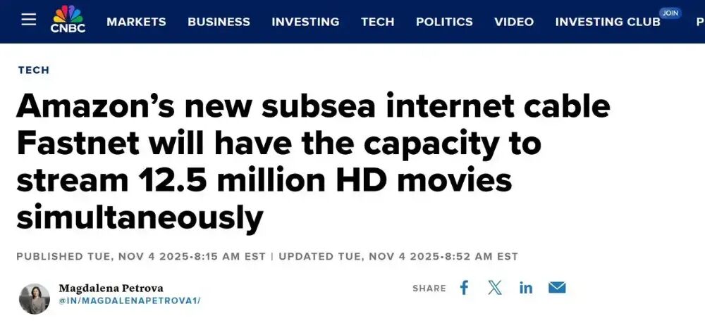 俗话说,要想富,先修路。 确实,交通便捷是经济发展的重要基础。 完善的交通体系,能够突破地理阻隔,降低交易成本,激活资源价值,最终促进经济发展。 货物的流通,靠水路、公路、铁路等交通基础设施。 数据的传输,靠的是什么"路"? 野心 据电信行业权威研究机构TeleGeography统计显示,全球约有530多条现役海底光缆系统,总长度约为148万公里。 这相当于绕地球赤道35圈以上,是人类建造的最大规模基础设施之一。 海底光缆承担了全球95%以上国际互联网流量,是名副其实的"信息高速公路"。 我们日常使用的跨境视频通话、海外网购、国际金融交易等,背后都离不开海底光缆。 正因如此,谷歌、亚马逊等科技巨头,正在巨量投资海底光缆,掀起了一场"海底暗战"。 11月6日,亚马逊正式宣布启动了全新跨大西洋海底光缆项目"Fastnet"。 该光缆将连接美国马里兰州与爱尔兰科克郡,预计2028年投入运营。 答案,是海底光缆。 一场"海底暗战",开始了! 新闻报道 同年6月,谷歌与智利政府签署了一项关于建设海底光缆的协议。 根据协议,谷歌与智利政府将共同在南太平洋海底铺设一条连接智利港口城市瓦尔帕莱索和澳大利亚悉尼的14800公里 ...