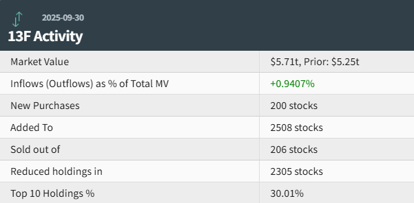 投资组合总览 - 截至2025年9月30日第三季度持仓总市值达5.71万亿美元,较上一季度的5.25万亿美元环比增长8.76% [1][2] - 投资组合出现净流入,流入金额占投资组合总市值的比例为+0.9407% [2] - 投资组合调整活跃,新增200只个股,增持2508只个股,同时减持2305只个股并清仓206只个股 [1][2] - 前十大重仓股合计占投资组合总市值的30.01% [1][2] 前十大重仓股持仓详情 - 英伟达为第一大重仓股,持仓约19.29亿股,市值约3599.61亿美元,占投资组合6.30%,持仓数量较上季度增加1.02% [3][6] - 微软为第二大重仓股,持仓约5.92亿股,市值约3065.54亿美元,占投资组合5.37%,持仓数量较上季度增加1.77% [3][6] - 苹果为第三大重仓股,持仓约11.46亿股,市值约2918.91亿美元,占投资组合5.11%,持仓数量较上季度减少0.22% [4][6] - 前十大重仓股还包括亚马逊、博通、META、谷歌-A、特斯拉、谷歌-C和摩根大通 [4][5][6] 重点个股调仓操作 - 显著增持科技巨头,包括增持英伟达1947万股、微软1028万股、亚马逊952万股、博通131万股、Meta 116万股、特斯拉78万股 [6] - 对部分科技股进行减持,包括减持苹果251万股、谷歌-A 178万股、谷歌-C 301万股 [6] - 在金融板块增持了摩根大通、伯克希尔-B、Visa、万事达卡等公司 [7] - 减持了医药股礼来 [7] 买入与卖出标的排行 - 按持仓比例变化计算,前五大买入标的为英伟达(持仓比例增加0.56%)、特斯拉(增加0.36%)、博通(增加0.21%)、Applovin(增加0.19%)和Palantir Technology(增加0.14%) [8][10] - 按持仓比例变化计算,前五大卖出标的为好市多(减少0.11%)、礼来(减少0.10%)、赛富时(减少0.09%)、赫斯(减少0.07%)和安斯科技(减少0.07%) [9][10]