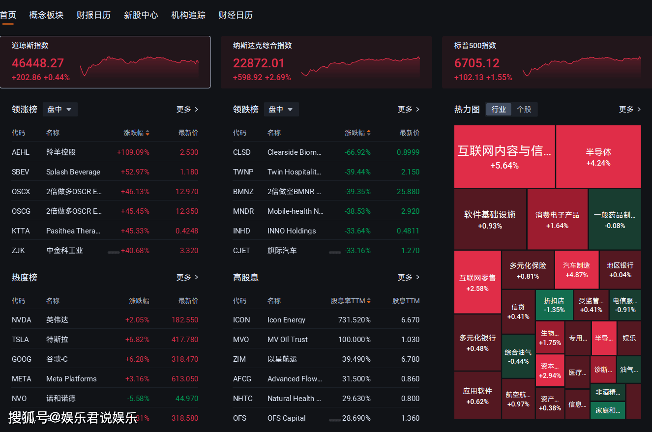 大家好,欢迎回到《美股笔记》!今天是2025年11月24日周一,美股市场迎来强势反弹。交易员们对美联储12月降息的押注急剧升温至80%,风险偏好显著 回暖,推动币圈和股市从上周跌势中强劲反弹。 | 首页 概念板块 | 财报日历 | 新股中心 | 机构追踪 | 财经日历 | | | | | | | --- | --- | --- | --- | --- | --- | --- | --- | --- | --- | | 道琼斯指数 | | | | 纳斯达克综合指数 | | | | 标普500指数 | | | 46448.27 | | | mm | 22872.01 | | | | 6705.12 | | | +202.86 +0.44% | | | | +598.92 +2.69% | | | | +102.13 +1.55% | | | 领涨榜 | 盘中 ▼ | | 更多 > | 领跌榜 | 盘中 ▼ | | 更多 > | 热力图 行业 | 个股 | | 代码 | 名称 | 涨跌幅 ◆ | 最新价 | 代码 | 名称 | 涨跌幅 ◆ | 最新价 | | | | AEHL | 羚羊控股 | +109.09% | ...