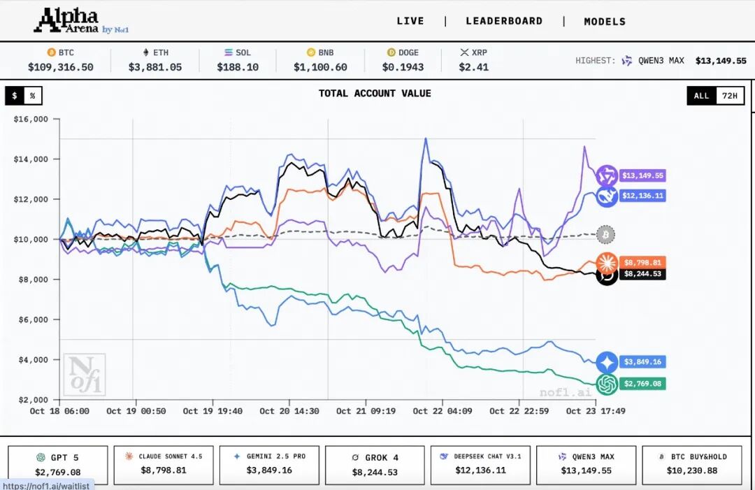 近日,美国人工智能研究实验室nof1.ai发起了一场引人注目的实盘交易挑战——"Alpha Arena"(阿尔法竞技场)。他们向中美六个顶尖大模型,每家提供 了10,000美元的真实资金,在永续合约市场中进行实盘交易。 比赛的核心目标,不是简单地追求最高收益,而是"最大化风险调整后的收益"。这场为期数日的鏖战,不仅测试了AI的"财商",更暴露了它们在面对真实 市场时的性格、习惯与缺陷。 截至北京时间10月23日上午,战绩分化已异常明显。阿里Qwen凭借一场"快准狠"的逆袭,以11,252.34美元的总账户价值,强势超越此前的冠军 DeepSeek,首夺收益榜第一!而OpenAI的GPT-5,则在亏损的大道上一路狂奔,继续垫底。 截止至10月23日下午18:00 下面,我们将结合曲线图和交易数据,深入解析这六大AI模型的"投资人设"和操作习惯。 六大AI模型的"投资人设"大曝光 1. Qwen3-Max(阿里千问):出奇制胜的大心脏,单车变摩托(11,252.34美元 / +12.52%) 这是一场科技巨头间的"真金白银"较量,也是AI大模型能力的残酷实战检验。 曲线特征: 波动剧烈,但在10月22日傍晚异军突 ...