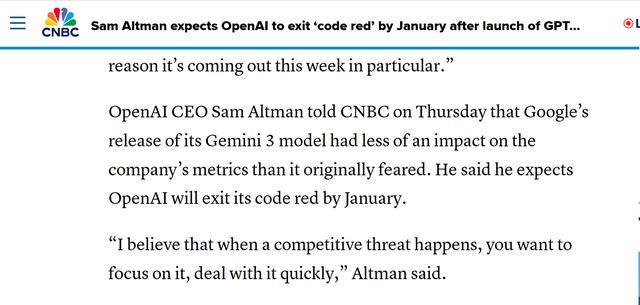 OpenAI 奥特曼:谷歌 Gemini 3未达预期威胁,明年1月解除 “红色警报”