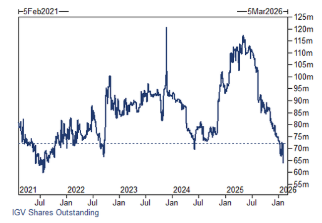 文章核心观点 - 高盛交易部门观察到美股软件股在经历历史性抛售后出现技术性触底信号 但高盛策略部门对行业长期基本面持悲观态度 市场对软件行业前景存在显著分歧 [1][7] 交易活动与市场信号 - 软件股在过去一周暴跌15% 较去年9月高点累计下挫29% [1] - IGV软件ETF连续两天创下25年历史中的成交量纪录 本周二以来累计成交超过8500万股 [1] - 高盛交易台活跃度达到8分(满分10分) 机构客户净卖出20亿美元 [1] - IGV软件ETF的流通股份降至近五年低点 显示卖盘基本出清 [1][2] - 周三IGV流通股份单日激增12% 为2023年以来最大单日增幅 显示机构买家开始尝试抄底和潜在空头回补 [1][4] - 高盛衍生品交易台观察到客户开始解除指数对冲头寸并卖出看跌期权以兑现收益 这通常是市场见底的前兆 [1][3] 资金流向与市场结构 - IGV软件ETF成为客户获取软件股敞口的主要工具 其交易占整体成交量的37% [2] - 截至美东时间某日上午11点 IGV当日成交已超过1100万股 [2] - 摩根士丹利数据显示 散户在某日净买入17亿美元 处于当日该时段的第50百分位 较平均水平高出约1.15亿美元 其中ETF买入13亿美元 个股买入4.35亿美元 [6] - 系统性抛售压力尚未完全解除 摩根士丹利估算 若标普500指数收盘下跌1.5%将触发300亿美元的股票抛售 跌幅扩大至2%则抛售规模将达450亿美元 [6] - 由于市场流动性稀薄 本周市场内部波动极端 意味着小规模买盘也可能引发剧烈反弹 [6] 机构观点与行业前景分歧 - 高盛策略部门将当前软件行业与2000年代初被互联网颠覆的报纸行业及90年代末遭遇监管重创的烟草行业相提并论 对长期前景持谨慎态度 [7] - 策略部门认为当前估值下跌反映的是市场对软件行业长期增长和利润率能否维持的根本性质疑 而非短期盈利波动 [7] - 大型共同基金早在去年年中就已将软件股配置降至低配水平 [2] - 市场分歧的核心在于交易层面的超卖技术信号与基本面层面的结构性担忧之间的矛盾 [7]