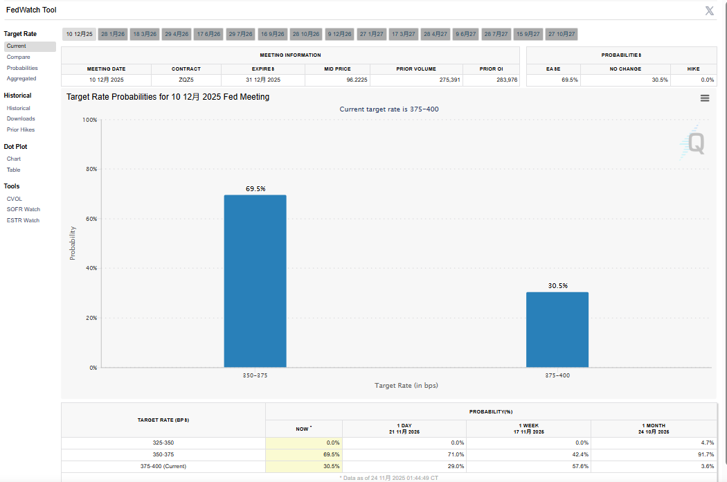 11月24日,美联储理事克里斯托弗·沃勒(Christopher Waller)重申其观点,支持在12月降息。 沃勒表示,自美联储上次会议以来,现有数据显示变化不大,通胀并非大问题。"我担心的是劳动力市场,主张在12月降息。" 【导读】美联储理事沃勒:主张在12月降息 中国基金报记者 李智 11月24日,美联储理事沃勒主张在12月降息,现货黄金短线拉升。 美联储理事沃勒:主张在12月降息 此外,沃勒还透露,大约10天前与美国财长贝森特谈过,两人会谈非常顺利。目前美国政府正在寻找一位有经验、知道如何胜任这项工作(美联储主席) 的人。 11月24日,据CME"美联储观察",美联储12月降息25个基点的概率为69.4%,维持利率不变的概率为30.6%。美联储到明年1月累计降息25个基点的概率为 56.9%,维持利率不变的概率为20.8%,累计降息50个基点的概率为22.3%。 沃勒称,大多数私营部门数据显示就业市场疲软,没有迹象表明企业即将掀起招聘热潮,9月份就业数据可能会被下修。明年1月份将充满挑战,大量数据 将陆续公布,以判断是否需要再次降息,需要逐次进行评估。如果数据出现反弹,可以更加谨慎。 "通胀率有所上升 ...