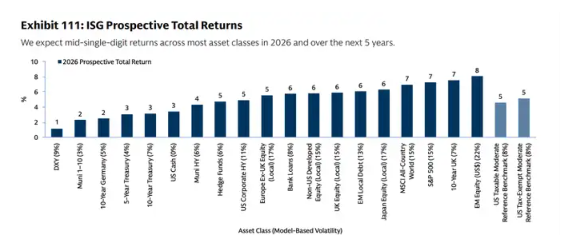 高盛财富管理对全球资产未来回报的展望 - 核心观点:高盛财富管理部门认为,未来一年和五年内,全球最理想的理财和投资地点是新兴市场股市,而非美国 [1] 新兴市场股票预期回报 - 新兴市场股票的预期基本回报率最高,为8%,并赋予其55%的实现概率 [2] - 预计新兴市场回报率超出预期的概率为20%,出现中低个位数负回报的概率为25% [2] - 在所有市场中,对新兴市场基本预期回报率的波动幅度最大 [2] - 未来5年新兴市场股票的年化收益率预期为6% [2] 其他主要市场股票预期回报 - 以标普500指数为代表的美股预期收益率排名第二,未来12个月增长率为7%,未来5年的平均收益率为6% [6] - 英国股票和MSCI全球所有国家指数在未来5年的预期收益率分别位居第三和第四,平均收益率均为5% [7] 对美股高估值的看法 - 尽管美股估值处于历史高位,但高盛否定了存在泡沫的论断,认为随着市场持续表现优异,美股价格仍将保持高位 [8] - 评估美股的一个重要方面是美国经济波动性的下降,较低的波动性意味着企业盈利的稳定性更强,进而支撑了更高的股票估值水平 [8] - 估值本身对继续投资或退出市场的投资决策影响有限 [8] 相关投资工具 - 提供该银行预期表现最佳交易敞口的基金包括:iShares MSCI新兴市场交易所交易基金(EEM)、SPDR 标普500交易所交易基金信托(SPY)、富兰克林英国富时指数交易所交易基金(FLGB)以及 iShares MSCI ACWI交易所交易基金(ACWI) [8]