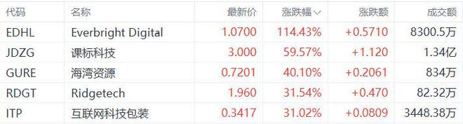个股涨幅表现 - Everbright Digital股价上涨114.43%至1.0700美元,成交额为8300.5万美元 [1] - 课标科技股价上涨59.57%至3.000美元,成交额为1.34亿美元 [1] - 海湾资源股价上涨40.10%至0.7201美元,成交额为834万美元 [1] - Ridgetech股价上涨31.54%至1.960美元,成交额为82.32万美元 [1] - 互联网科技包装股价上涨31.02%至0.3417美元,成交额为3448.38万美元 [1]
