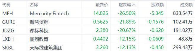 个股表现 - Mercurity Fintech股价跌幅最大,下跌26.5%至14.825美元,成交额为833.54万美元 [1] - 海湾资源股价下跌21.89%至0.5625美元,成交额为102.41万美元 [1] - 课标科技股价下跌20.67%至2.38美元,成交额为191.02万美元 [1] - 丽翔教育股价下跌12.15%至0.4402美元,成交额为48.8万美元 [1] - 天际线建筑集团股价下跌12.13%至3.26美元,成交额为299.43万美元 [1]