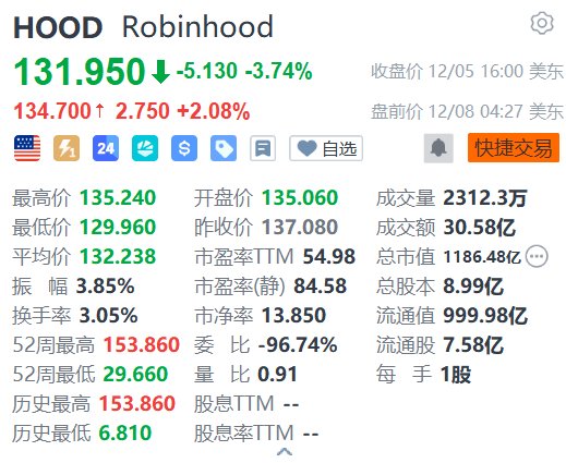 Robinhood进军印尼 盘前涨2.08%报134.7美元