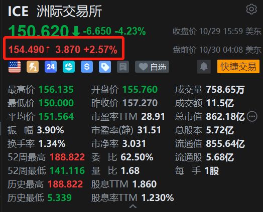 | ICE 洲际交易所 | | | | --- | --- | --- | | 150 620 4 -6.650 -4.23% | | 收盘价 10/29 15:59 美东 | | 154.490 + 3.870 +2.57% | | 盘前价 10/30 04:08 美东 | | 三 7 24 华 S 5 日 ♥ 白选 | | ● 快捷交易 | | 最高价 156.135 | 开盘价 155.760 | 成交量 758.65万 | | 最低价 150.000 | 昨收价 157.270 | 成交额 11.5亿 | | 平均价 151.564 | 市福率IIM 28.91 | 总市值 862.18亿 (... | | 振 幅 3.90% | 市盈率(静) 31.51 | 总股本 5.72亿 | | 换手率 1.34% | 市净率 3.031 | 流通值 855.64亿 | | 52周最高 188.822 | 委 比 62.50% | 流通股 5.68亿 | | 52周最低 141.116 | 量 比 1.68 | 每 手 1股 | | 历史最高 188.822 | 股息TTM 1.860 | | | 历史最低 ...