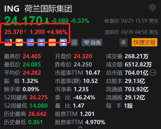 美股异动丨荷兰国际盘前涨5%,Q3销售额、每股收益均超预期