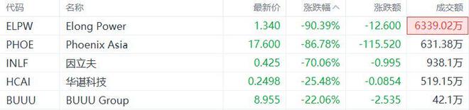 美股异动丨Elong Power跌90.39%,为跌幅最大的中概股