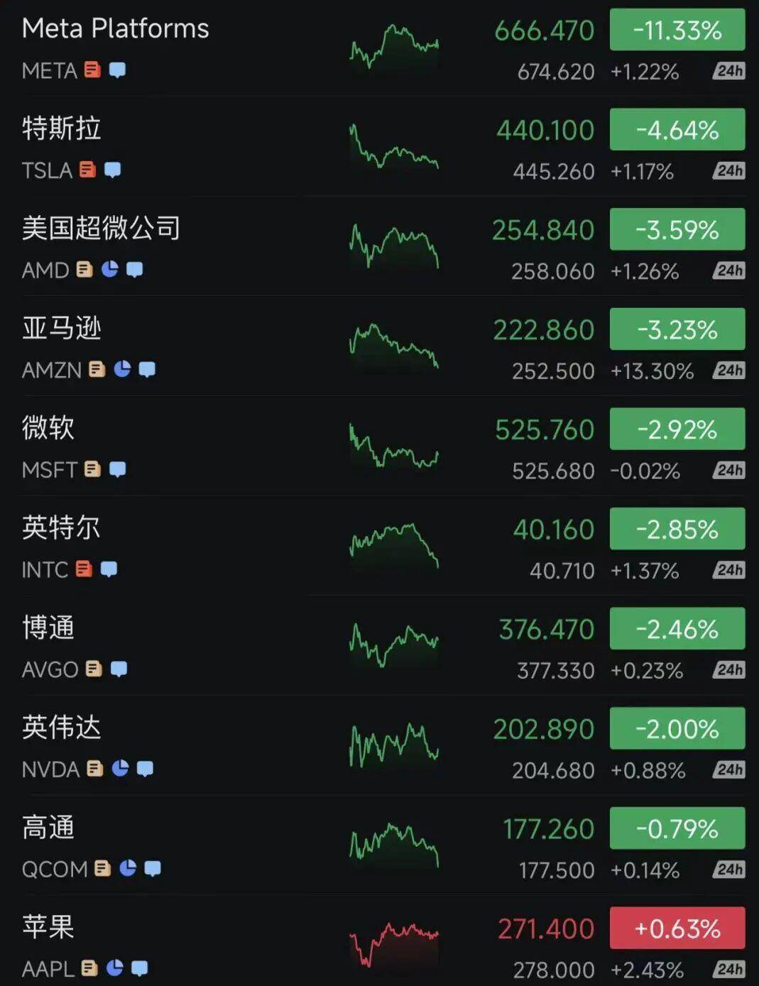 一夜之间,美股科技巨头集体"雪崩"!市值蒸发超1.5万亿的Meta带头暴跌,黄金却冲破4000美元大关。这场动荡背后,竟是美国参议院一场51:47的投 票结果,直接掀翻了特朗普的"全球征税"政策! | Meta Platforms | 666.470 | -11.33% | | --- | --- | --- | | META ■ | 674.620 | +1.22% | | 特斯拉 | 440.100 | -4.64% | | TSLA ■ | 445.260 | +1.17% | | 美国超微公司 | 254.840 | -3.59% | | AMD B # # | 258.060 | +1.26% | | 亚马逊 | 222.860 | -3.23% | | AMZN B C | 252.500 | +13.30% | | 微软 | 525.760 | -2.92% | | MSFT ■ ● | 525.680 | -0.02% | | 英特尔 | 40.160 | -2.85% | | INTC B O | 40.710 +1.37% | | | 博通 | 376.470 | -2.46% | | A ...