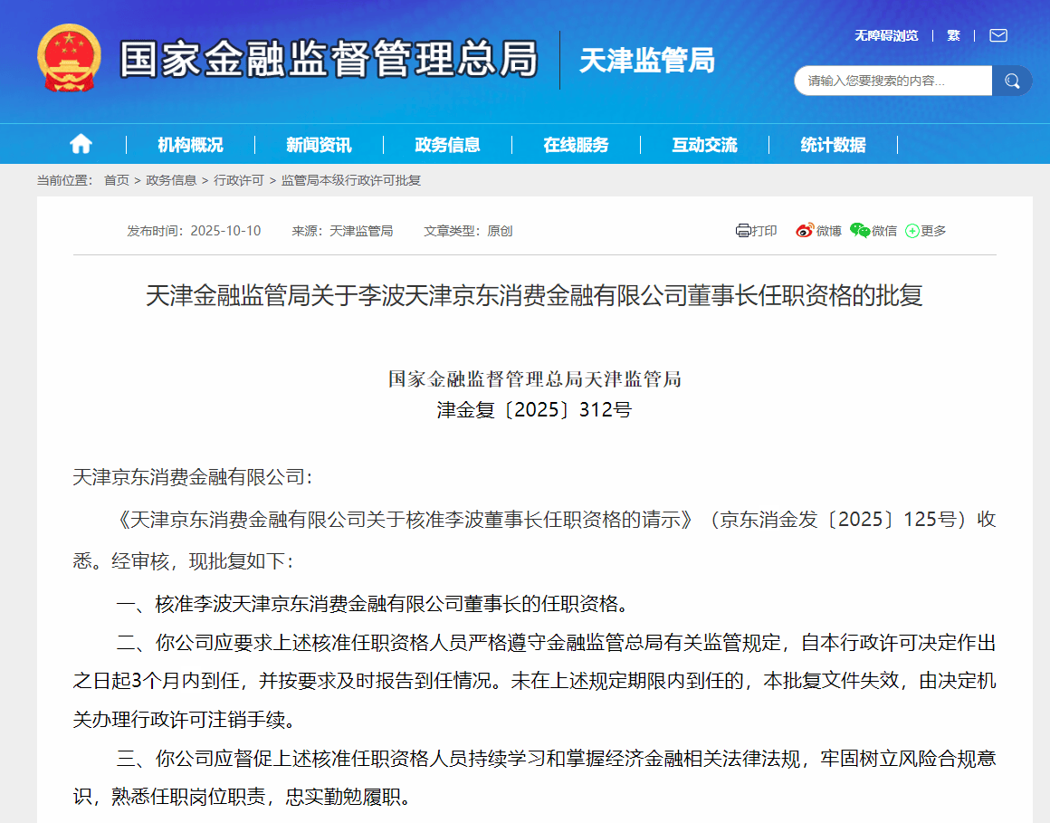 互联网巨头旗下消金公司终于迎来新"掌舵人"。 10月10日,天津金融监督管理局发布批复公告称,核准李波天津京东消费金融有限公司(下称"京东消 金")董事长的任职资格。 "75后"金融老将掌舵京东消金 公告显示,核准李波天津京东消金董事长的任职资格,要求其严格遵守金融监管总局有关监管规定,自 本行政许可决定作出之日起3个月内到任,并按要求及时报告到任情况。 公开资料显示,李波出生于1975年,为金融行业"老将",有超过20年的金融从业经验,此前曾担任工商 银行湖南省分行副行长。于2021年3月加入京东集团后,李波一直担任金融科技群要职,今年以来曾多 次以京东集团副总裁、京东科技金融科技事业群总裁参与活动。 9月26日,在2025·青岛创投风投大会上,李波出席并发表主题演讲,他表示,金融在这几年一直在持续 探索大模型技术和金融业务的结合点,经过多年时间已经从技术验证逐步走向了场景新增,覆盖场景从 用户交互到体验创新到目前智能风控智能决策效率在提升。 "科技是手段,普惠才是目的。AI驱动的重构之路,最终还是要落在普惠上,做好科技金融、绿色金 融、普惠金融、养老金融、数字金融五章大文章,让供应链金融科技广泛汇集每一个 ...