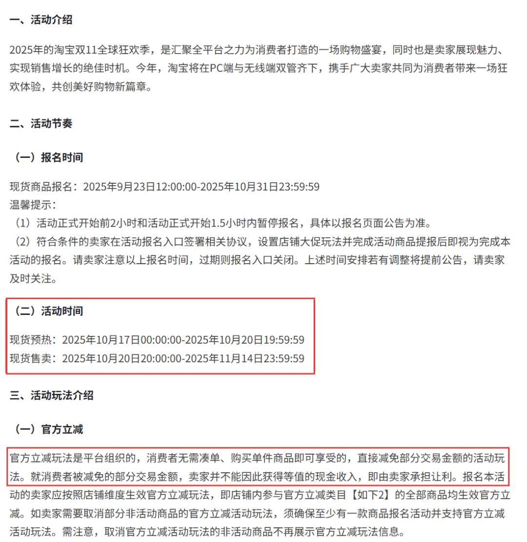 购物节的发令枪尚未真正响起,但竞争的硝烟已弥漫整个十月。 "官方立减"、"一件直降"、"无需凑单"成为今年双十一的关键词。 京东主打"官方直降,低至一折",消费者购买单件商品即可直接享受价格立减优惠。抖音电商同样推 出"立减折扣""一件直降"等活动,立减优惠力度为15%及以上。 淘宝推出官方立减玩法,消费者无需凑单、购买单件商品即可享受直接减免。小红书平台则设定了"立 减15%及以上"的核心门槛。 规则简化的背后是消费者决策疲劳的现实。张宇晨援引调研数据称,43%的消费者认为活动规则复杂, 促销周期过长导致决策疲劳。 网经社电子商务研究中心主任曹磊表示:"过去几年,大促玩法过于复杂,不仅增加了商家学习与执行 成本,也提高了消费者的参与门槛。" 02 寻找新增量,平台各显神通 在存量竞争时代,各大平台纷纷开辟新战场,出海和即时零售成为今年双11最显著的两大趋势。 国庆假期刚刚结束,京东、抖音便在10月9日率先启动双11大促。快手更是早在10月7日就已开启预售, 将这场年度消费盛宴与"十一黄金周"无缝衔接。 京东此次以37天周期创下"史上最早双11"纪录,抖音则将双11与中秋促销合并。淘天集团相对从容,按 计划于 ...