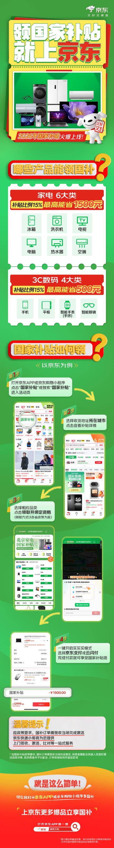 2026年国家补贴政策全面实施 - 2026年国家补贴政策已全面实施 甘肃省兰州市的朱女士成为首批受益者 通过国补政策在京东家电专卖店购买热水器节省约600元 这也是2026年国补在甘肃落地的全省第一单 [1] - 消费者在京东购买活动指定的冰箱、洗衣机、电视、空调、电脑、热水器产品 单件/单次至高补贴1500元 购买活动指定的手机、平板、智能手表手环、智能眼镜产品 单件/单次至高补贴500元 单人累计至高可省11000元 [3] 京东作为政策落地核心承接方 - 京东线上线下全面承接2026年国补落地 [3] - 自2024年“两新”政策实施以来 京东采销、客服、研发、物流等数十万工作人员积极参与 以极大的热情和资金投入 全力保障国家补贴高效、普惠落地 [3] - 为更好地配合以旧换新政策落地普惠 进一步促进乡村消费提振 京东在承接以旧换新工作的基础上 2025年针对乡镇及以下地区累计投入近300亿元 用于商品补贴、营销推广、物流履约、服务能力建设等 [3] - 未来 京东将持续做好两新政策的落地实施工作 助力国家换新补贴高效、安全地覆盖广大消费者 [3] 政策对消费市场的影响 - 政策有效降低了消费者的换新成本 [3] - 政策与市场的积极协同 不仅切实提升了消费者的幸福感 也进一步增强了市场发展信心 [3] - 京东为广大乡镇及以下地区消费者带去国家补贴与京东补贴的多重福利与海量产品 以及一站式高效国补换新体验 并助力当地经济高质量增长 [3] 具体消费案例 - 朱女士通过国补购买一台原价3000元的史密斯热水器 实际支付仅需2400元 节省约600元 [1]
