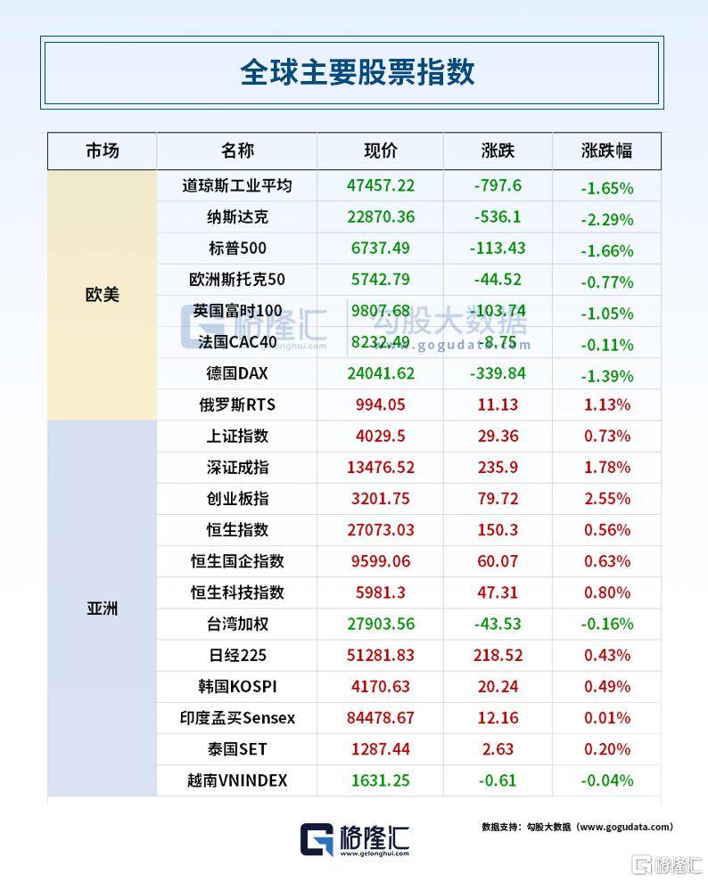 | 市场 | 名称 | 现价 | 涨跌 | 涨跌幅 | | --- | --- | --- | --- | --- | | 欧美 | 道琼斯工业平均 | 47457.22 | -797.6 | -1.65% | | | 纳斯达克 | 22870.36 | -536.1 | -2.29% | | | 标普500 | 6737.49 | -113.43 | -1.66% | | | 欧洲斯托克50 | 5742.79 | -44.52 | -0.77% | | | 英国富时100 | 9807.68 JL - 103.74 | | -1.05% | | | 法国CAC40 nabul.c | | 8232.49.gogudat8.75m | -0.11% | | | 德国DAX | 24041.62 | -339.84 | -1.39% | | | 俄罗斯RTS | 994.05 | 11.13 | 1.13% | | | 上证指数 | 4029.5 | 29.36 | 0.73% | | | 深证成指 | 13476.52 | 235.9 | 1.78% | | | 创业板指 | 3201.75 | 79.72 ...