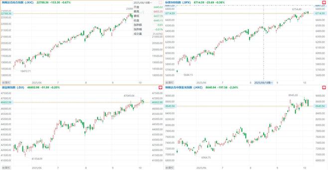 美股三大指数集体收跌 美股三大指数集体收跌,道指跌0.2%,纳指跌0.67%,标普500指数跌0.38%。热门科技股多数下跌,特斯拉跌超4%,谷歌跌超1%,AMD涨超3%,英特 尔涨超1%。加密货币概念、半导体设备与材料跌幅居前,Strategy跌超8%,科休半导体跌超7%,科磊跌超4%,阿斯麦跌近4%,Coinbase跌超2%。煤 炭、日用消费板块走高,雅诗兰黛涨超4%,宝洁、金佰利涨超1%。 | 道琼斯 | 46602.98 | | --- | --- | | | | | 纳斯达克 22788.36 -153.30 -0.67% | | | | | | 标普500 | 6714.59 | 纳斯达克中国金龙指数收跌2.24%,热门中概股普跌,世纪互联跌超6%,万国数据跌超5%,百度跌超4%,阿里巴巴、金山云跌超3%,哔哩哔哩跌近 3%,京东、名创优品、理想汽车跌超2%。 COMEX黄金期货收涨0.79%,报4007.9美元/盎司;COMEX白银期货收跌1.64%,报47.655美元/盎司。 WTI原油期货收涨0.06%,报61.73美元/桶。布伦特原油期货收跌0.03%,报65.45美元/桶。 法国国债市场 ...
