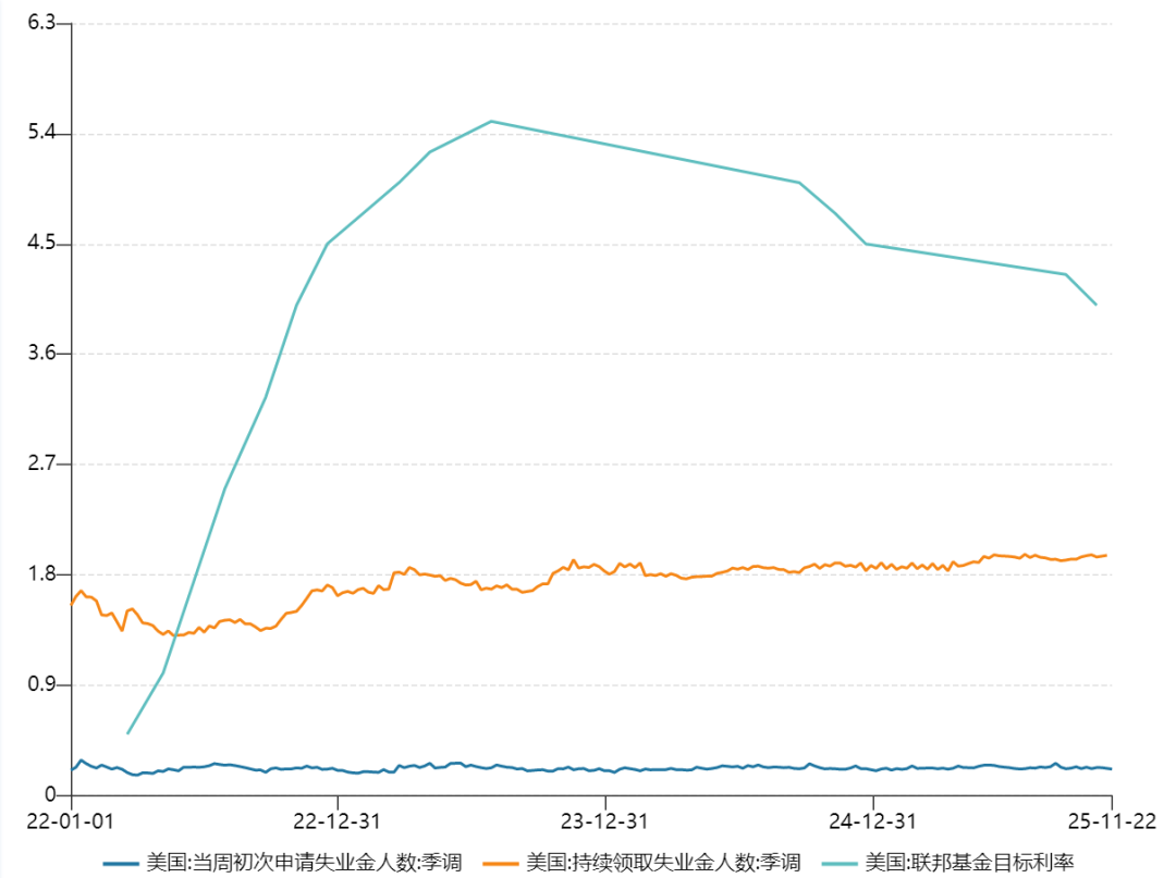 在美联储议息会议前发布的任何经济数据都在引发市场的关注。今日美国发布的周度初请失业金人数下降,表明就业情况并未恶化。虽然机构普遍预期, 美联储12月降息的概率非常大,但也有机构认为,美联储仍有机会暂停降息。 失业数据好于预期 美国劳工部周三公布的数据显示,截至11月22日当周,初请失业金人数经季节调整后减少6000人,至21.6万人。经济学家此前预计,上周初请失业金人数 为22.5万人。 美国初请失业金人数(百万人)、续请失业金人数(百万人)和基准利率走势 初请失业金是美国衡量劳动力市场状况的核心指标,特指统计周期内首次申请失业保险救济金的人数,由美国劳工部每周四定期发布。该指标通过追踪新 失业者申领救济的动态,直接反映企业裁员趋势和就业市场短期波动,被视为经济周期的先行指标。由于本周四是感恩节假期,该报告提前一天发布。 此外,续请失业金人数(衡量正在领取失业金人数的指标)则在前一周微升至196万人。自9月以来,续请失业金人数总体呈上升趋势,目前仍接近疫情后 劳动力市场复苏时期的水平。 (文章来源:证券时报) 德国商业银行报告指出,周三公布的美国周度初请失业金数据因其他劳动力市场数据缺失而获得额外关注。但由于 ...