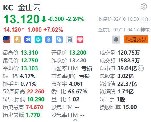 美股异动丨金山云盘前大涨超7% 高盛料其将受惠于小米持续加大对AI发展的投资