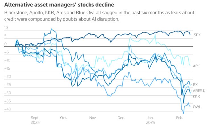 文章核心观点 - 人工智能技术对传统软件行业的颠覆性冲击,正通过其融资渠道传导至规模高达3万亿美元的私人信用债市场,引发对该市场资产质量的严重担忧和风险重估 [1][8][12] 市场反应与股价影响 - Anthropic发布新型AI工具后,引发软件数据供应商股票抛售,担忧AI将削弱借款企业现金流并推高违约风险,市场震荡迅速传导至资产管理领域 [1] - 拥有庞大私人信用债业务的资产管理公司股价上周遭遇重挫:Ares Management大跌超过12%,KKR下跌近10%,Blue Owl Capital跌幅超过8%,TPG下跌约7% [1] - 同期标普500指数仅微跌约0.1%,凸显市场对私人信用债敞口公司的集中抛售 [1] - KKR股价在过去5天累计下跌9.87% [3] 私人信用债市场的风险敞口与结构 - 软件行业是私人信用债机构青睐的投资标的,占美国商业发展公司投资交易数量的17%,仅次于商业服务业 [8] - 许多大规模的单层贷款流向了软件公司,市场对该行业的高度集中使得任何风吹草动都会被放大 [8][9] - 软件和服务公司占据了实物支付贷款的最大份额,这种允许推迟支付现金利息的结构在借款人财务状况恶化时极具风险 [10] - 私人信用债市场因高杠杆、估值不透明以及缺乏透明度而备受关注,其规模达3万亿美元 [12] AI颠覆带来的具体信用风险 - 瑞银警告,若AI颠覆性影响加速,美国私人信用债的违约率在激进情景下可能飙升至13%,显著高于其对杠杆贷款和高收益债券的压力测试估算值 [8] - Anthropic的新工具旨在执行复杂的专业任务,直接挑战了许多传统软件公司的收费项目和业务护城河,引发市场对其未来偿债能力的质疑 [9] - 专家指出,AI颠覆可能对部分软件和服务行业的借款人构成信用风险,具体取决于企业在AI技术曲线上的位置,未能及时跟上技术变革的企业将面临严峻考验 [9] - AI的冲击给本已存在流动性问题和贷款延期现象的私人信用债领域增加了新的风险层级 [9] 系统性隐忧与行业前景 - 摩根大通CEO曾警告,私人信用债市场中单个借款人的压力可能预示着更多隐藏的麻烦 [12] - 穆迪分析首席经济学家指出,AI相关借贷的快速增长、不断攀升的杠杆率以及缺乏透明度是明显的警示信号,预计会出现严重的信用问题 [10] - 专家警示,如果当前的信用增长持续下去,行业在一年后可能无法较好地吸收损失 [10] - 企业软件公司自2020年以来一直是私人信用债机构的宠儿,但如今市场必须准备好应对AI驱动的颠覆性影响,这种不确定性正迫使投资者重新审视相关并购交易 [12]
