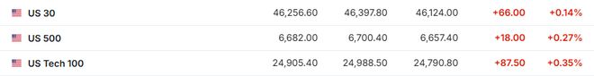 盘前市场动向 1. 10月20日(周一)美股盘前,美股三大股指期货齐涨。截至发稿,道指期货涨0.14%,标普500指数期货 涨0.27%,纳指期货涨0.35%。 | ■ US 30 | 46,256.60 | 46,397.80 | 46,124.00 | +66.00 | +0.14% | | --- | --- | --- | --- | --- | --- | | # US 500 | 6,682.00 | 6,700.40 | 6,657.40 | +18.00 | +0.27% | | 監 US Tech 100 | 24,905.40 | 24,988.50 | 24,790.80 | +87.50 | +0.35% | 2. 截至发稿,德国DAX指数涨1.12%,英国富时100指数涨0.38%,法国CAC40指数跌0.17%,欧洲斯托 克50指数涨0.64%。 | ■ 德国DAX30 | 24,113.52 | 24,163.99 | 24,005.70 | +268.11 | +1.12% | | --- | --- | --- | --- | --- | --- | | 器 英国富时100 ...