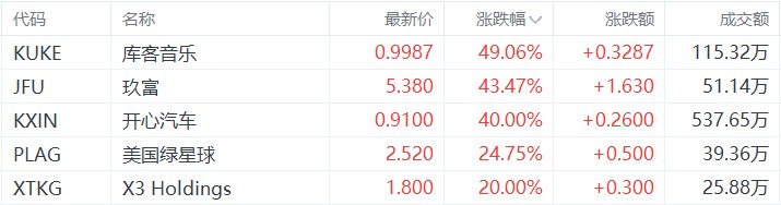 | 代码 | 名称 | 最新价 | 涨跌幅√ | 涨跌额 | 成交额 | | --- | --- | --- | --- | --- | --- | | KUKE | 库客音乐 | 0.9987 | 49.06% | +0.3287 | 115.32万 | | JFU | 玖富 | 5.380 | 43.47% | +1.630 | 51.14万 | | KXIN | 开心汽车 | 0.9100 | 40.00% | +0.2600 | 537.65万 | | PLAG | 美国绿星球 | 2.520 | 24.75% | +0.500 | 39.36万 | | XTKG | X3 Holdings | 1.800 | 20.00% | +0.300 | 25.88万 | 中概股收盘涨幅前五的个股为:库客音乐涨49.06%,玖富涨43.47%,开心汽车涨40%,美国绿星球涨 24.75%,X3 Holdings涨20%。(格隆汇) ...