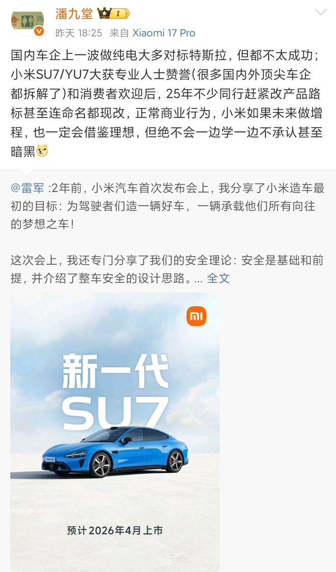 行业竞争格局与对标策略演变 - 上一轮国内车企在纯电领域普遍以特斯拉为对标对象,但整体成效有限 [1] - 小米SU7及YU7车型自发布以来,不仅获得大量消费者认可,更赢得众多国内外顶尖车企的关注 [1] 小米汽车对行业产生的直接影响 - 受小米产品成功影响,2025年已有不少车企迅速调整产品规划,甚至临时更改车型命名策略 [6] 对行业模仿与创新关系的看法 - 模仿是创新的重要基础,没有哪家成功企业不曾大量借鉴他人经验 [6] - 仅靠模仿无法实现长期成功 [6] - 产业进步与社会发展源于一群聪明的人和企业在相互模仿与启发中不断微创新,彼此推动、共同内卷,从而实现整体跃升 [6] - 模仿、学习、对标都是正常商业实践,不应被污名化 [6] 公司潜在技术路线规划 - 若小米未来布局增程式技术路线,也一定会认真借鉴理想汽车的经验 [6] - 强调在借鉴过程中绝不会一边学习一边否认,甚至暗中贬低对方 [6]