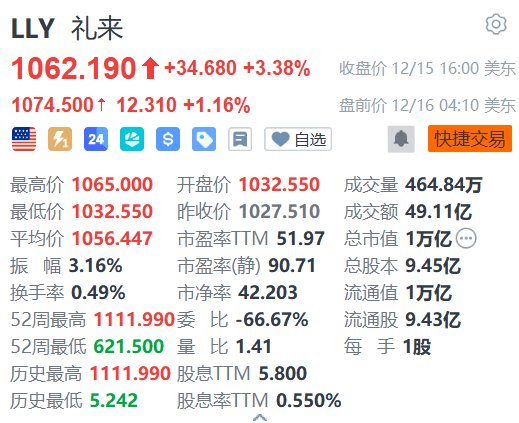 昨日收涨3.38%的礼来(LLY.US)今日美股盘前续涨1.16%,报1074.5美元。消息面上,礼来旗下的实验性 口服减肥药orforglipron的审批进程有望明显提速,最快可能在2026年3月底获得美国食品药品监督管理 局(FDA)的监管决定。根据文件披露,FDA曾考虑将其"加速审评凭证(expedited voucher)"项目下的受理 评估时间,从目前的60天缩短至1周,虽然最终方案调整为两至三周,但仍将显著快于原有流程。(格隆 汇) | O LLY 礼来 | | | --- | --- | | 1062.190↑ +34.680 +3.38% 收盘价 12/15 16:00 美东 | | | 1074.500 + 12.310 +1.16% | 盘前价 12/16 04:10 美东 | | 二 24 24 4 8 8 8 8 8 0 | ● 快捷交易 | | 最高价 1065.000 开盘价 1032.550 成交量 464.84万 | | | 最低价 1032.550 昨收价 1027.510 | 成交额 49.11亿 | | 平均价 1056.447 市盈率 TM 51.97 | 总市值 1万 ...